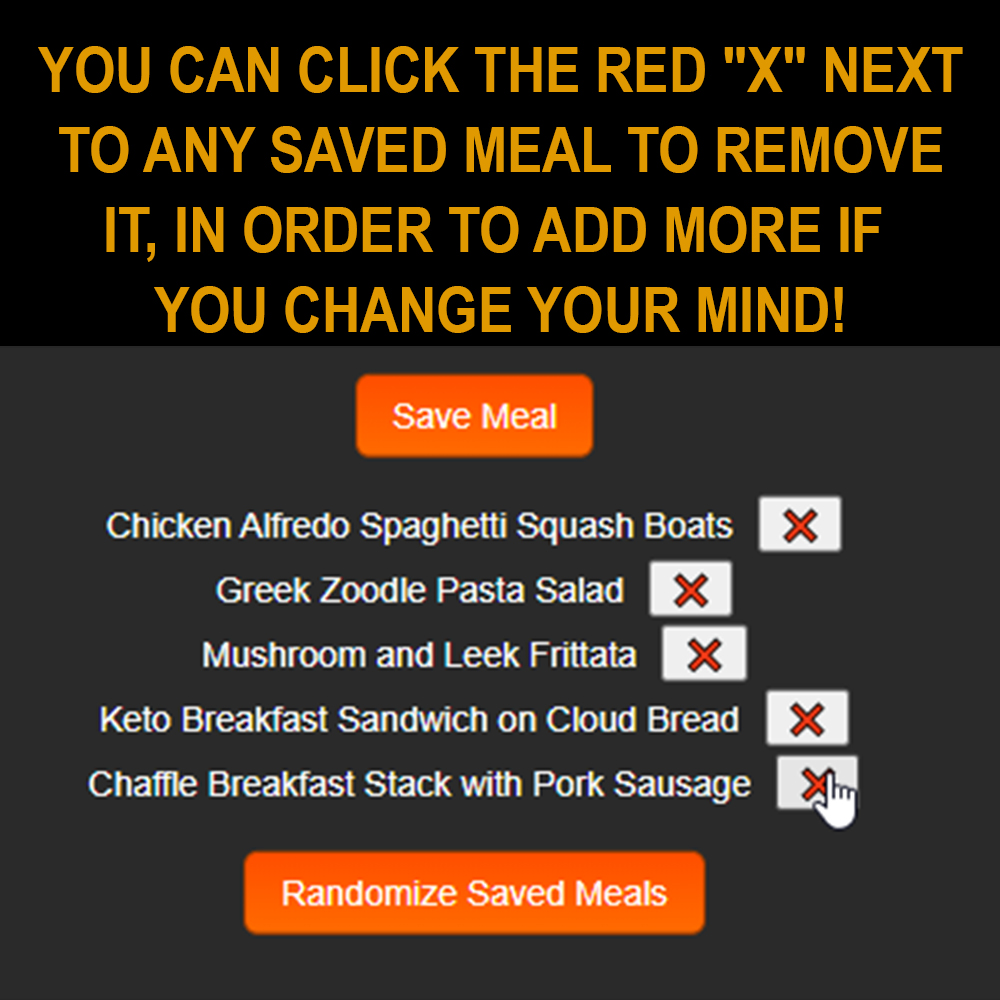 Step 4: Click the red “X” next to any saved meal to remove it — useful if you want to add something new instead.
